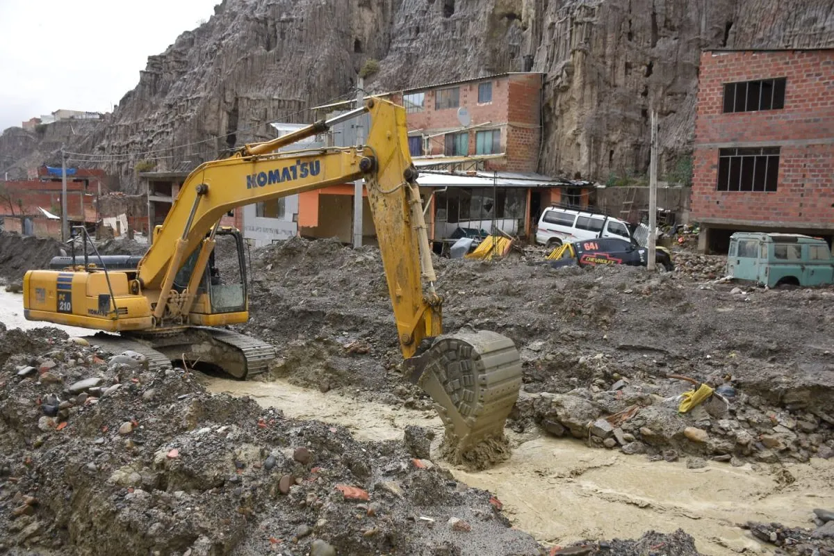 En Bajo Llojeta se mantiene la emergencia y maquinaria trabaja en la limpieza de material arrastrado por las últimas lluvias. Foto: APG