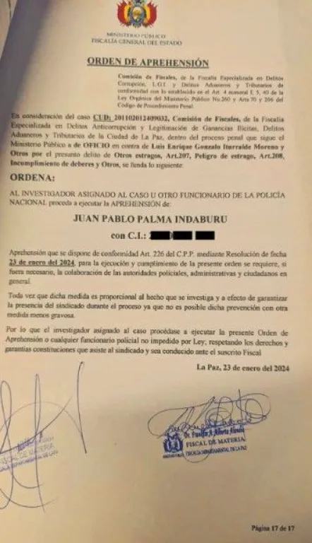 Amparo Morales, directora Jurídica de la Alcaldía, explicó que la única razón que presentó la Fiscalía para proceder a la aprehensión de Palma es el riesgo de obstaculización a la investigación porque no existen indicios de que él sea responsable de lo sucedido en Bajo Llojeta.