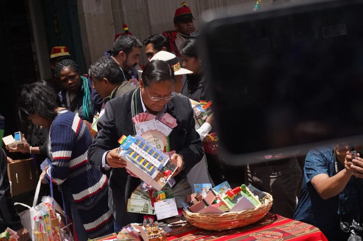El presidente Luis Arce dijo al mediodía de este viernes, en medio de la inauguración de la feria de Alasita que “desea abundancia y prosperidad para toda la familia boliviana”, mientras repartía casitas y billetes a un grupo de personas en la Plaza Murillo.