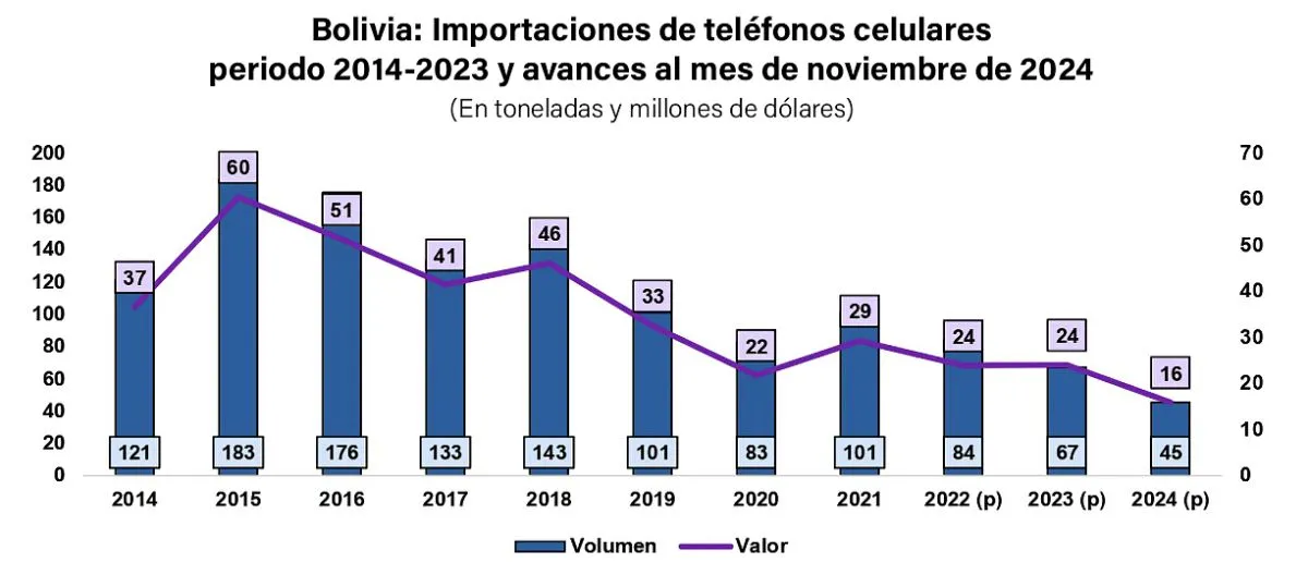 Datos del Instituto Nacional de Estadística (INE), procesados por el Instituto Boliviano de Comercio Exterior (IBCE), revelan que el pico máximo de importaciones de celulares se dio en los años 2015 con 60 millones de dólares y 51 millones de dólares en 2016.