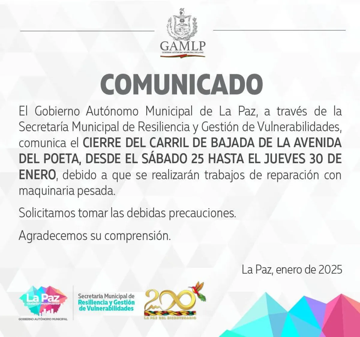 “El Gobierno Autónomo Municipal de La Paz, a través de la Secretaría Municipal de Resiliencia y Gestión de Vulnerabilidades, comunica el cierre del carril de bajada de la Avenida del Poeta, desde el sábado 25 hasta el jueves 30 de enero, debido a que se realizarán trabajos de reparación con maquinaria pesada”, señala el comunicado.