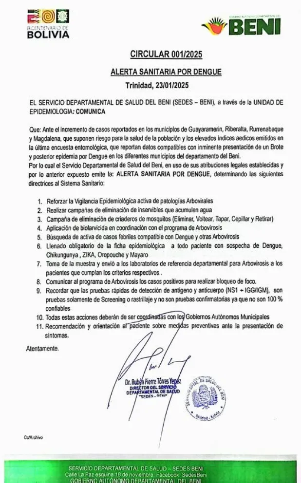 Ante el incremento de casos de dengue en cuatro municipios, el Servicio Departamental de Salud (Sedes) del Beni declaró la Alerta Sanitaria en la región. Este es el segundo departamento del país que declara la alerta por esta enfermedad.