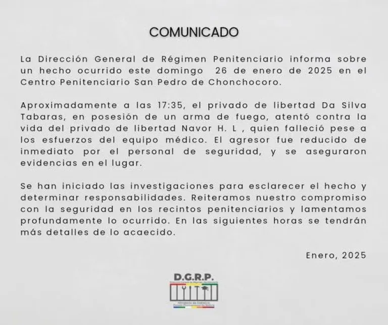 Ayer, domingo, aproximadamente a las 17.35, "el privado de libertad Da Silva Tabaras, en posesión de un arma de fuego, atentó contra la vida del privado de libertad Navor H. L, quien falleció pese a los esfuerzos del equipo médico. El agresor fue reducido de inmediato por el personal de seguridad, y se aseguraron evidencias en el lugar”, dice esa dependencia en un comunicado.