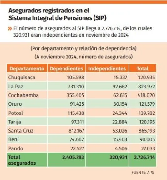 Datos de la Autoridad de Fiscalización y Control de Pensiones y Seguros (APS) revelan que en el país hay 2,7 millones de asegurados en el Sistema Integral de Pensiones (2.726.714 personas). De este número, solo 320.931 son trabajadores independientes, mientras que los dependientes alcanzan a 2,4 millones (datos a noviembre 2o24).