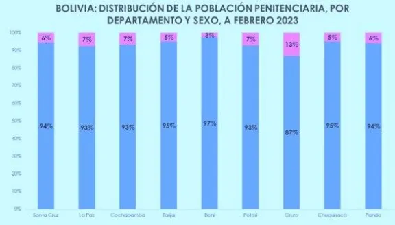 Sobre el tema de narcotráfico, se conoce que, por ejemplo, en 2023, en el penal de San Pedro de Oruro, el 62% de la población penitenciaria femenina está procesada por delitos vinculados a tráfico de drogas. Esto quiere decir que, del total, 214 mujeres, 133 fueron encarceladas por este tipo penal.