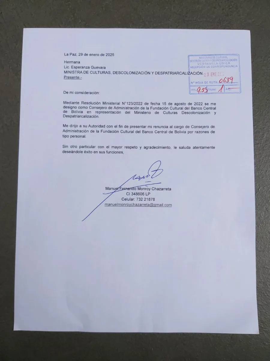 En una nota dirigida a la ministra de Culturas, Esperanza Guevara, el sindicado expresó: “Me dirijo a su autoridad con el fin de presentar mi renuncia al cargo de consejero de administración de la Fundación Cultural del Banco Central de Bolivia por razones de tipo personal”.