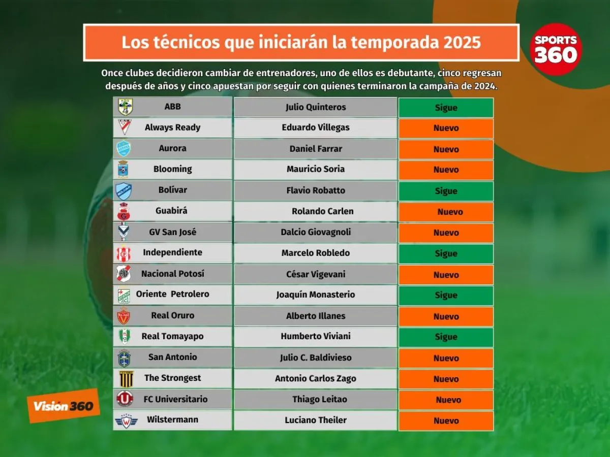 Eduardo Villegas cumplirá su tercer ciclo en Always Ready, Blooming apuesta por Mauricio Soria, San Antonio eligió a Julio Baldivieso, mientras que FC Universitario se decidió por Thiago Leitao.
