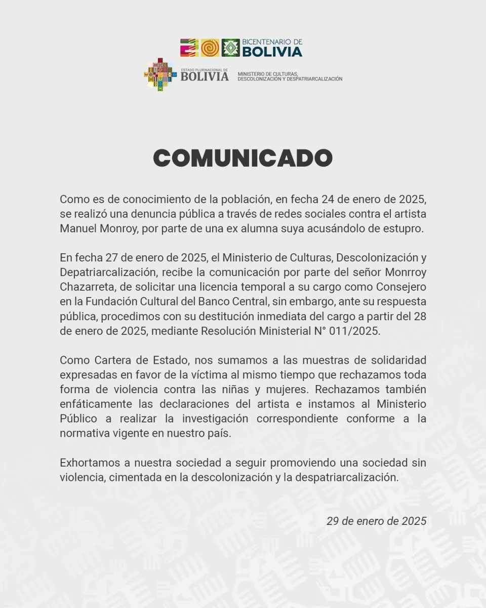 En el comunicado, el Ministerio de Culturas señala que Monroy había solicitado una licencia temporal a su cargo como Consejero de Administración de la FC-BCB; sin embargo, “ante su respuesta pública, se procedió con su destitución inmediata".