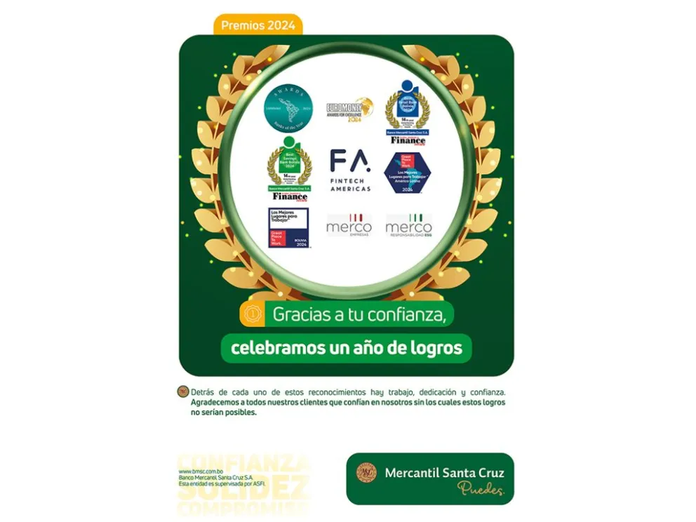 El Banco Mercantil Santa Cruz, que en 2025 cumplirá 120 años de presencia y liderazgo en Bolivia, destaca los premios y reconocimientos recibidos en 2024, como importantes hitos que reflejan sus valores de confianza y solidez.