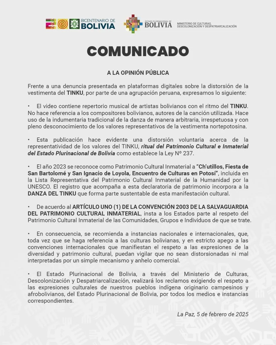 “El Estado Plurinacional de Bolivia, a través del Ministerio de Culturas, Descolonización y Despatriarcalización, realizará los reclamos exigiendo el respeto a las expresiones culturales de nuestros pueblos indígena originario campesinos y afrobolivianos, del Estado Plurinacional de Bolivia, por todos los medios e instancias correspondientes”, se lee en un comunicado emitido por esa cartera de Estado.