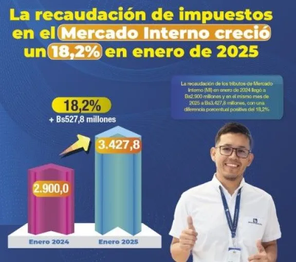 La recaudación del mercado interno creció en enero de este año en 18,2% y llegó a Bs 3.427,8 millones con relación a similar período de 2024 cuando fue de Bs 2.900 millones, según informó este lunes el presidente del Servicio de Impuestos Nacionales (SIN), Mario Cazón.