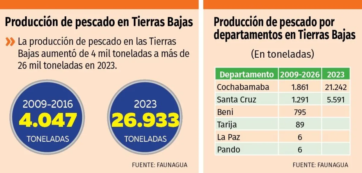 La producción promedio de pescado en el periodo 2009-2016 fue de 4.047 toneladas en tierras bajas, pero para 2023 había aumentado a 26.833 toneladas, según datos de Faunagua, expuestos en el III Simposio Internacional de Piscicultura Tropical sobre la “Piscicultura en Tierras Bajas de Bolivia”.