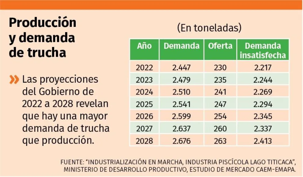 Este pescado está en el occidente y particularmente en el lago Titicaca y, de acuerdo con el estudio del Ministerio de Desarrollo Productivo, la producción de trucha en 2022 era de 230 toneladas, en 2023 de 235 toneladas y el año pasado, 241 toneladas. Para este año se proyectan 247 toneladas y un volumen creciente que en 2028 se situará en 263 toneladas.