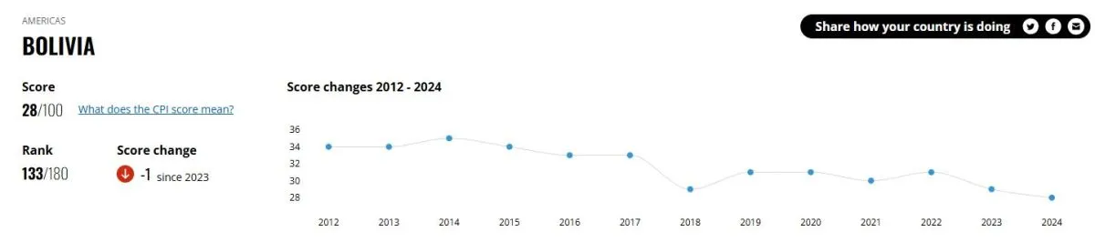 La puntuación conocida este martes (28), correspondiente al 2024, llega al nivel más bajo de Bolivia en los últimos 12 años. Hasta la actualización de esta jornada, tenía como sus peores registros los 29 puntos del 2023 y 2018.