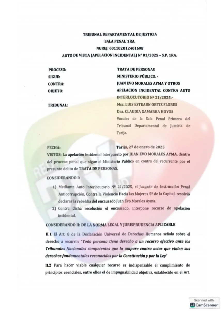 La Sala Penal Primera del Tribunal de Justicia de Tarija rechazó la apelación que presentaron los abogados de Evo Morales contra la orden de aprehensión que un juez dispuso en su contra por los delitos de trata de tráfico de personas.