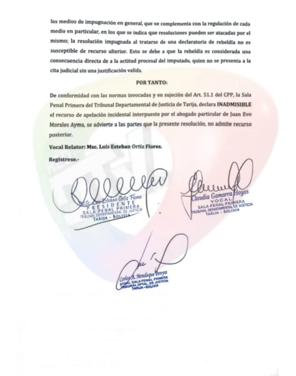 El tribunal departamental declaró “inadmisible el recurso de apelación incidental interpuesto por el abogado particular de Juan Evo Morales Ayma, se advierte a las partes que la presente resolución no admite recurso posterior”, según la resolución, fechada el 27 de enero en Tarija.