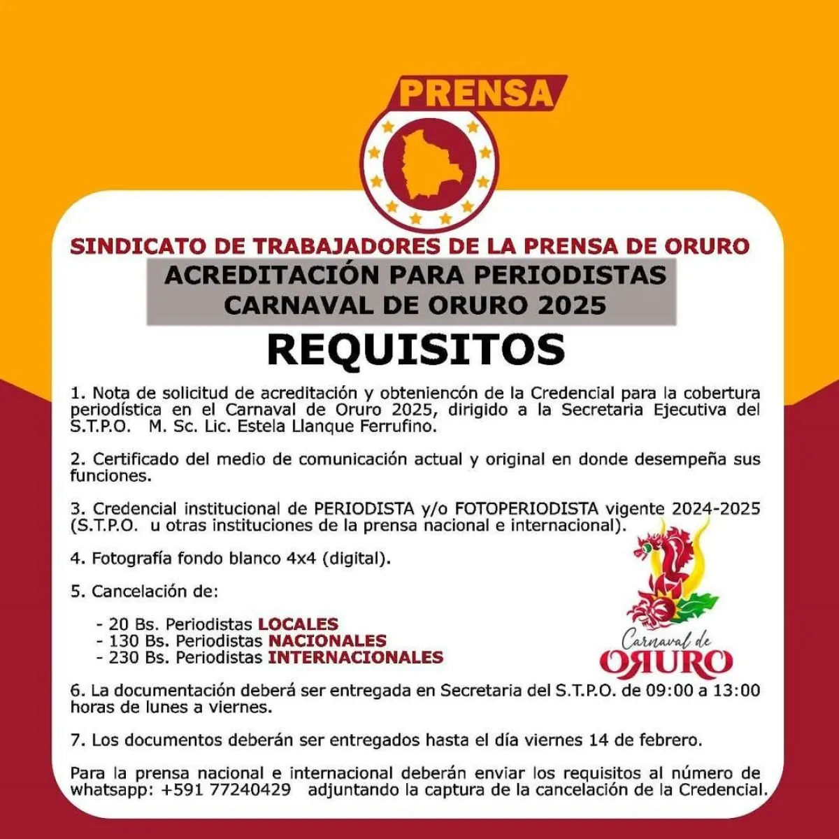 La norma impuesta –según esa entidad- obliga a los enviados de prensa a pagar 230 bolivianos (unos 33 dólares), que afecta a los periodistas que trabajan como “free lance”, quienes deben erogar costos de transporte y de logística, dado que no trabajan con dependencia laboral permanente, para la cobertura del Carnaval de Oruro.