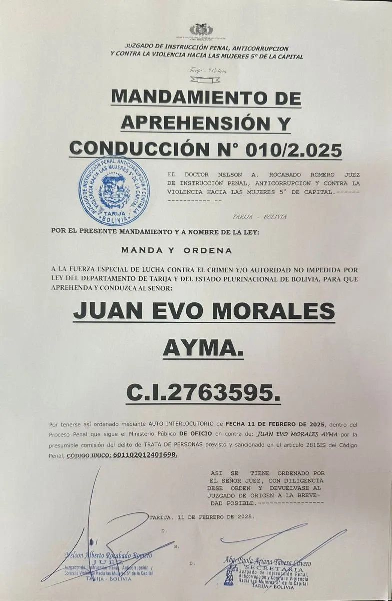 Luego de que la Sala Penal Primera del Tribunal de Justicia de Tarija rechazara una apelación que presentaron los abogados de Evo Morales contra la orden de aprehensión en su contra por el delito de trata de tráfico de personas, un juzgado de Tarija emitió una nueva orden de captura para el exmandatario.