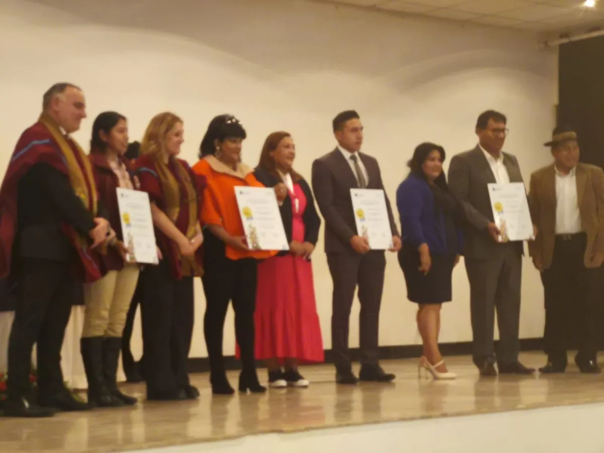 La alcaldesa de El Alto, Eva Copa recibe de la representante de Unicef,  Katya Marino la certificación plena de  "Municipio Amigo de la Niñez".