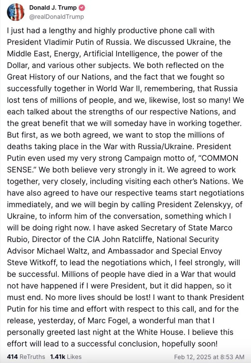 Trump detalló que Estados Unidos y Rusia "iniciarán negociaciones de inmediato" y que la delegación estadounidense estará encabezada por el secretario de Estado, Marco Rubio; el director de la CIA, John Ratcliffe; el asesor de Seguridad Nacional de la Casa Blanca, Michael Waltz, y el enviado especial, Steve Witkoff.