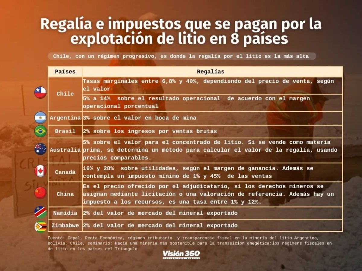 ¿Cuánto es la regalía de litio en otros países? Chile hasta 40%, Argentina 3% y Brasil 2%