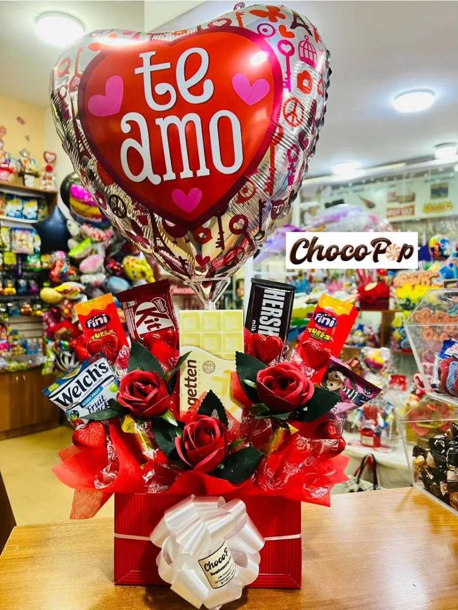 Chocopop una tienda de chocolates de La Paz llega con detalles y arreglos especiales de diferentes variedades de chocolate y globos de corazón.