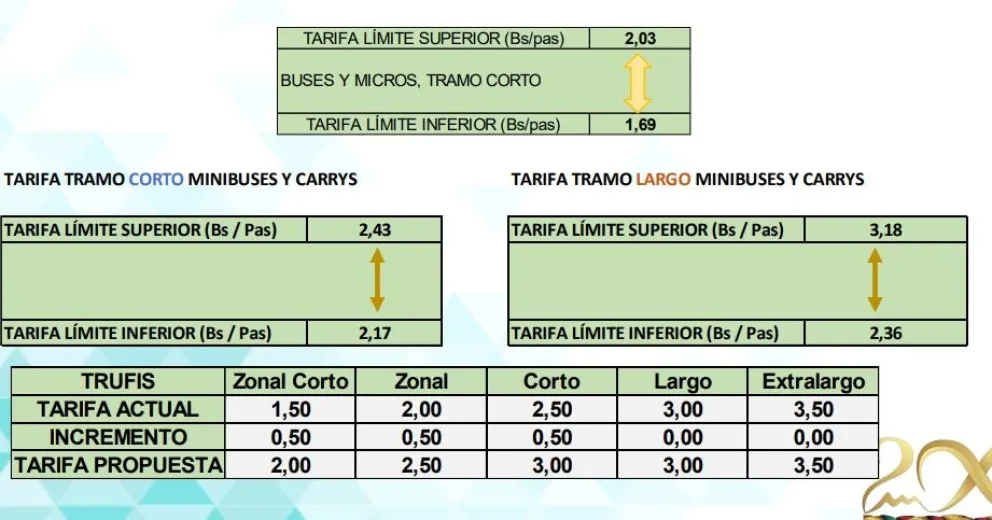 El estudio de la Alcaldía plantea en el caso de minibuses y carrys, en tramos cortos, 2,17 bolivianos como “tarifa límite inferior” y 2,43 bolivianos como “tarifa límite superior”. En tanto, el documento plantea en el caso de tramos largos la “tarifa límite inferior” de 2,36 bolivianos y 3,18 bolivianos como la “tarifa límite superior”.
