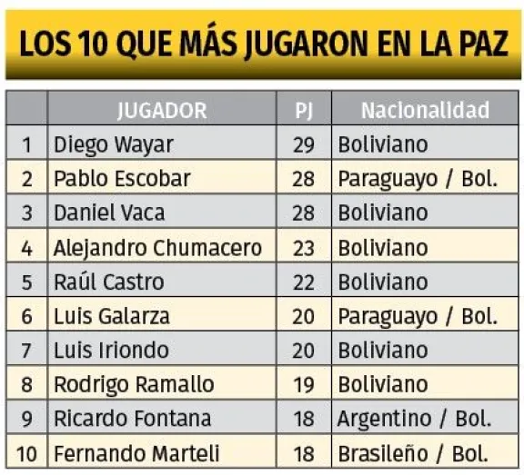 Una lista de destacados futbolistas que pasaron por el club completa el “top 10” de los que más partidos de Libertadores jugaron en La Paz.