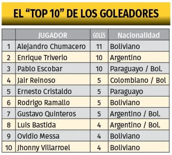 El podio de goleadores atigrados en La Paz se completa con el actual goleador del aurinegro, Enrique Triverio, quien solamente en tres años (2022, 2023 y 2024) ha marcado 10 tantos.