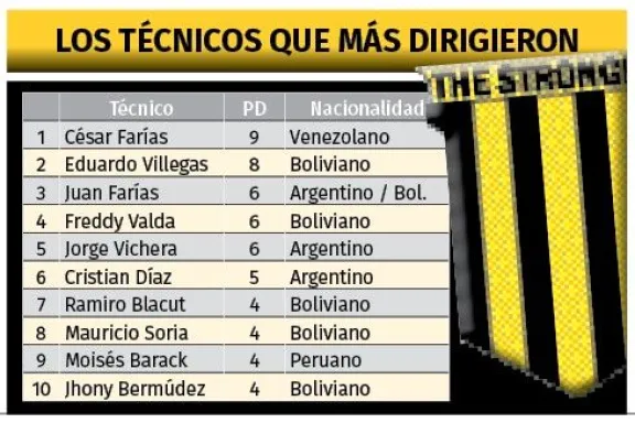En la tabla de presencias, en lo que respecta a técnicos, aparecen unos peldaños más abajo nombres ilustres como los de Freddy Valda, Juan "Gitano" Farías y Ramiro Blacutt, solo por citar algunos.