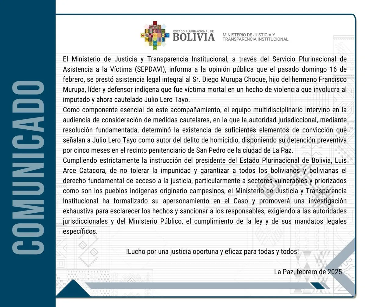 El Ministerio de Justicia informó este lunes, en un comunicado, que “a través del Servicio Plurinacional de Asistencia a la Víctima (SEPDAVI), el domingo 16 de febrero se prestó asistencia legal integral a Diego Murupa Choque, hijo de Francisco Murupa, líder y defensor indígena que fue víctima mortal en un hecho de violencia que involucra al imputado y ahora cautelado Julio L.T.