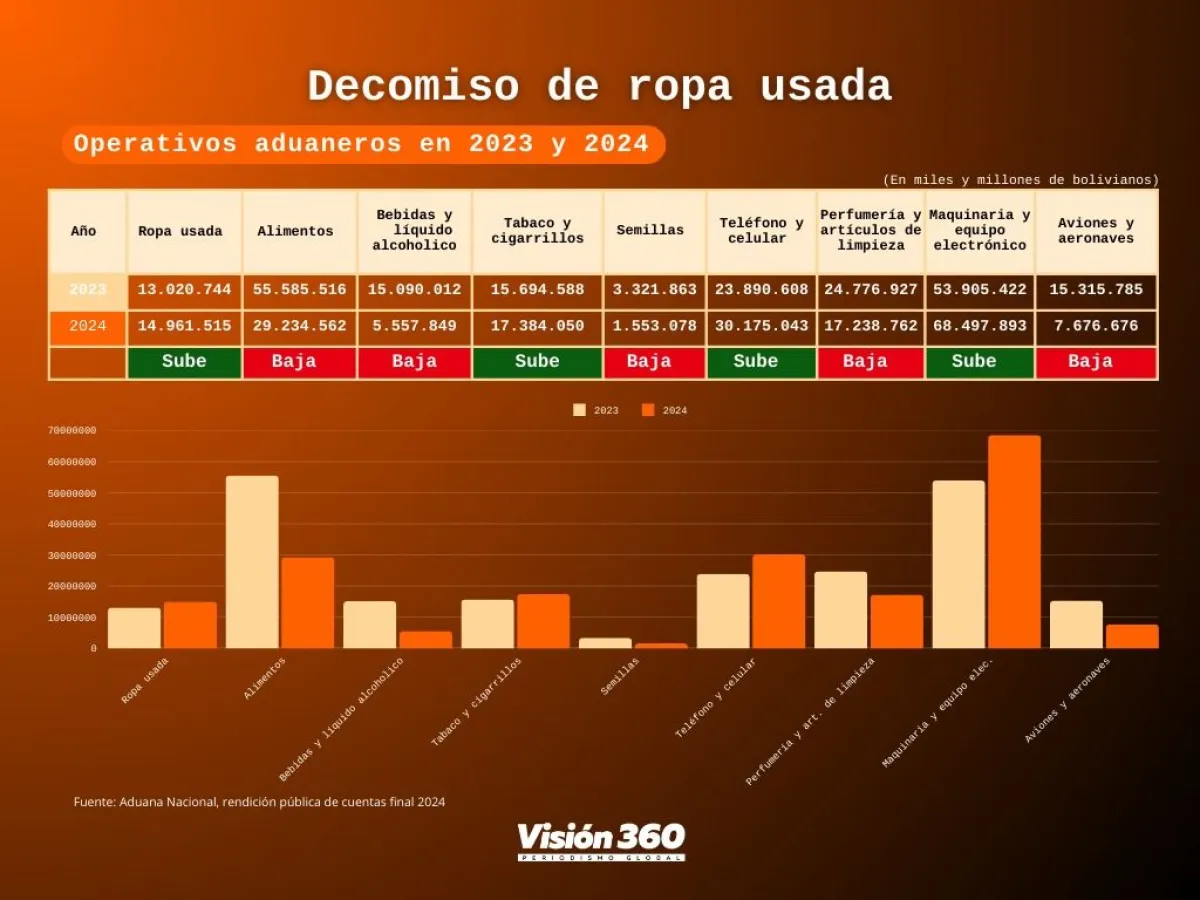 Añadió que del total comisado el año 2024, el 61% corresponde a vehículos, el 11% a maquinarias y equipos electrónicos y con un 5% teléfonos celulares y equipos telefónicos. En cambio, los alimentos comisados solo representaron el 5% y la ropa usada un 2%, es decir solo un 7% de todas las mercancías decomisadas la gestión pasada.