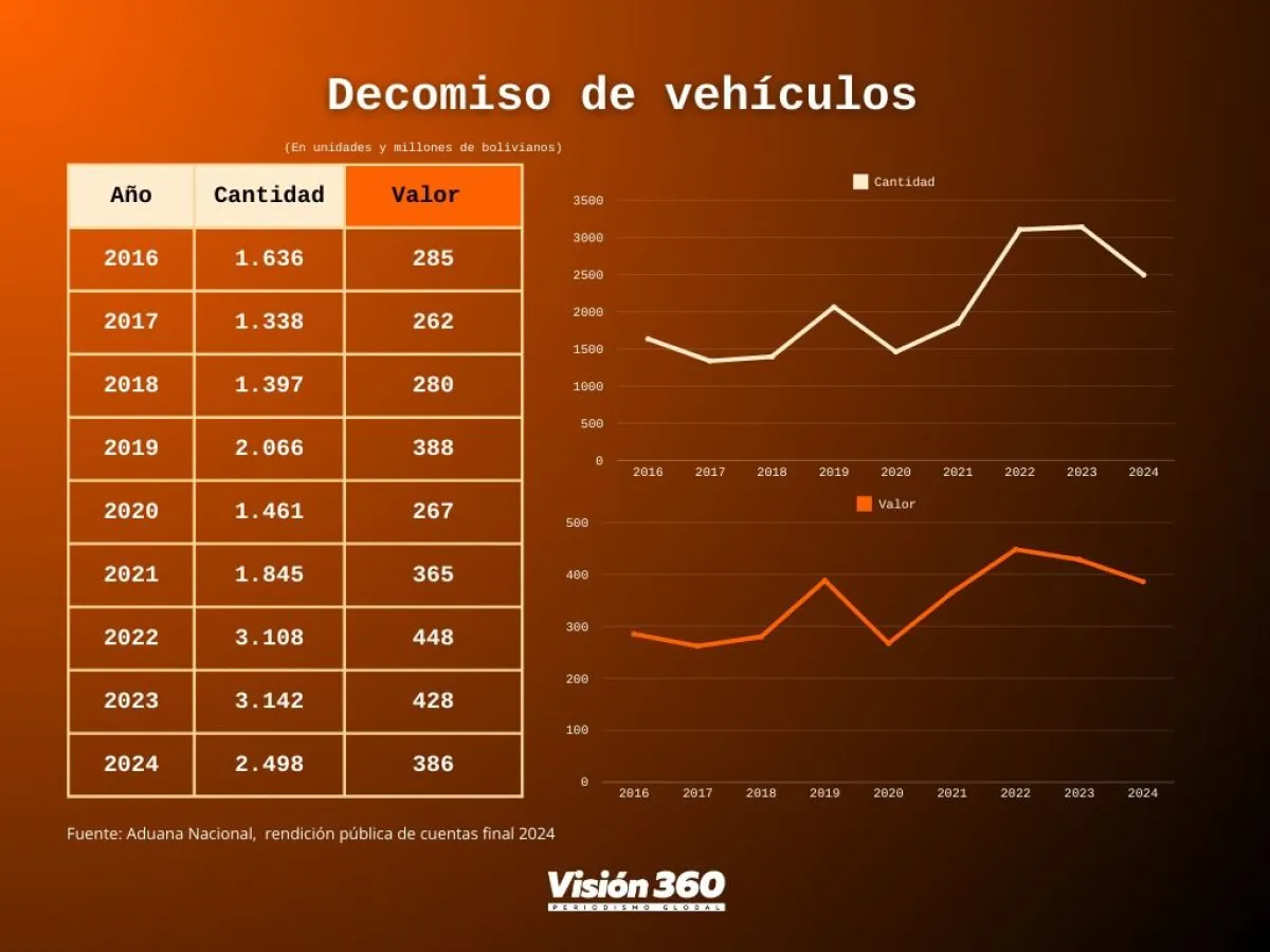Por ejemplo, se comisó un total de 2.498 vehículos por un valor de 386 millones de bolivianos, inferior a la cantidad de 3.142 autos incautados por 428 millones de bolivianos, obtenidos de 2023 o los 3.108 motorizados de 2022.