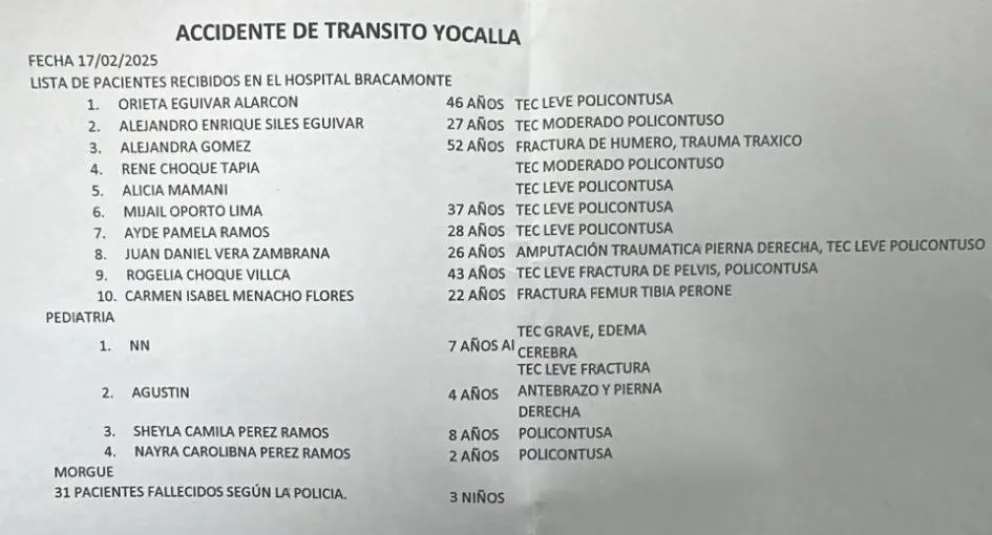 “Como ocurre en este tipo de eventos, la mayoría (de los pacientes presenta) traumatismo craneoencefálico, fracturas y contusiones. El número de pacientes que requiere intervención quirúrgica es elevado”, aseguró Camacho, según el diario El Potosí.