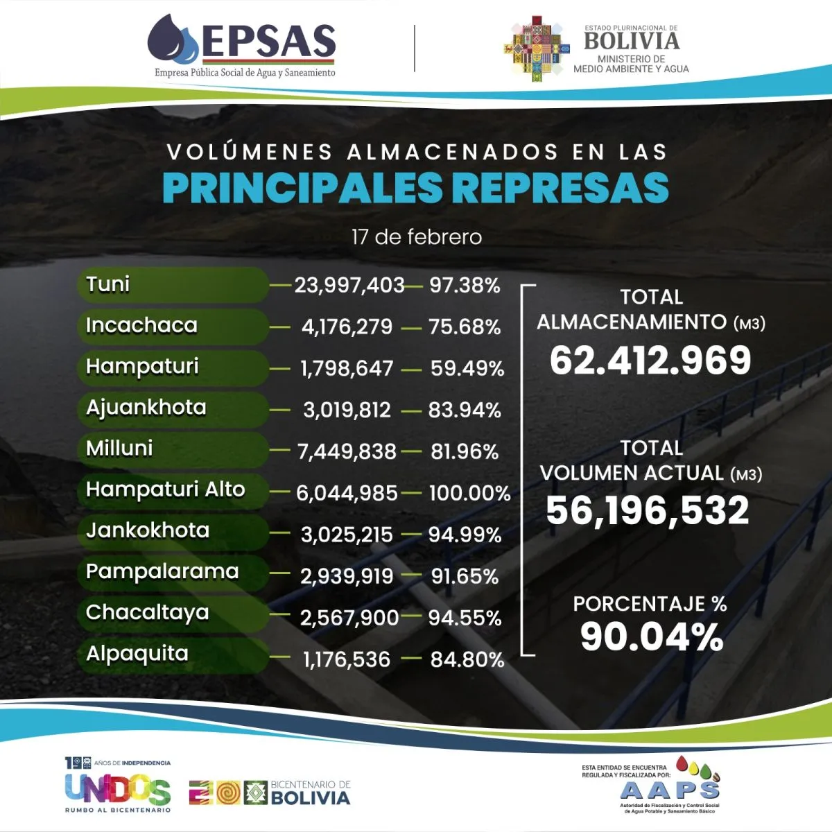 La Empresa Pública Social de Agua y Saneamiento (Epsas) informó este martes que las represas de La Paz están a un 90% de su capacidad. De un total de 62,4 metros cúbicos (M3) de capacidad, las represas tienen hasta la fecha un volumen de 56,1 M3, como resultado de las constantes lluvias.