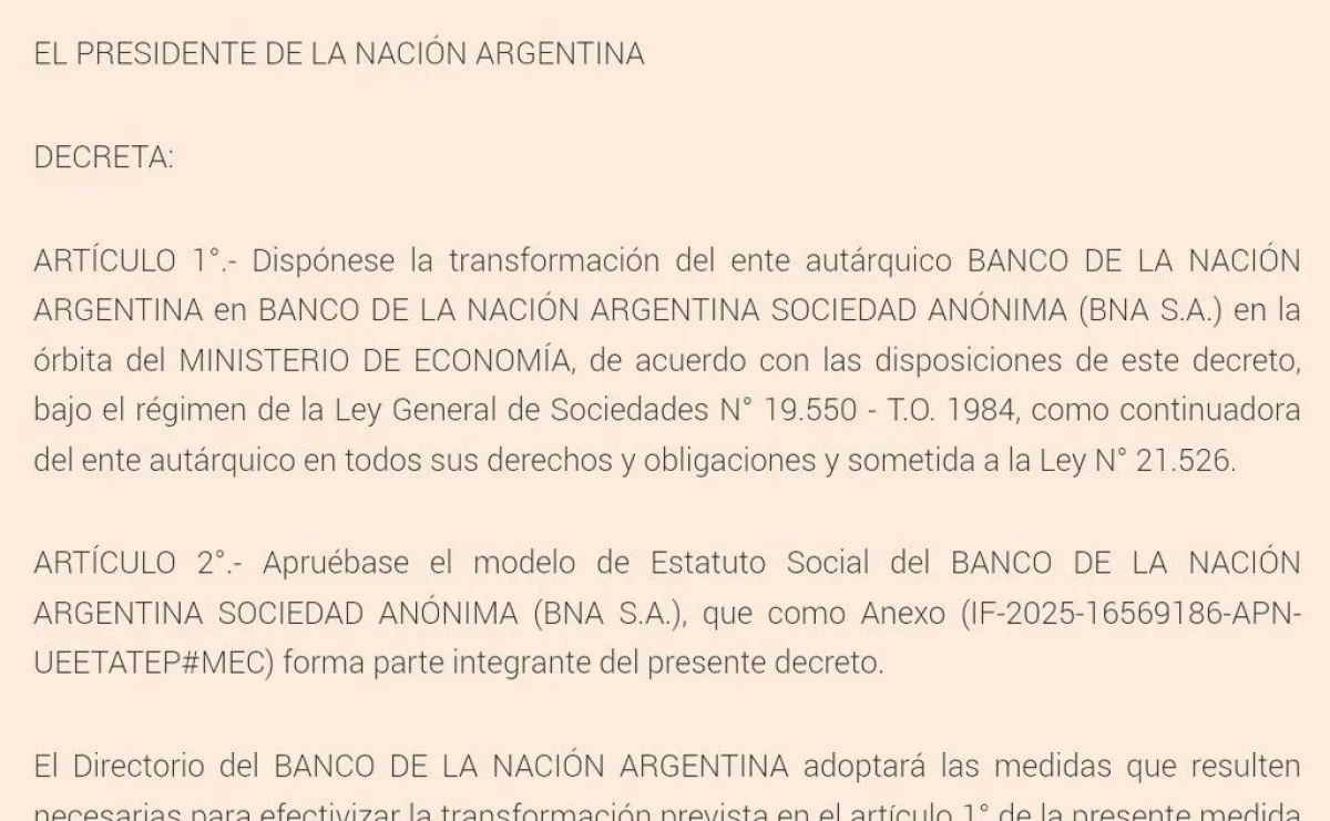 En el decreto, publicado en los primeros minutos de este jueves en el Boletín Oficial, se establece que los accionistas de la nueva sociedad anónima son el Estado argentino, con una participación del 99,9%, y la Fundación Banco de la Nación Argentina, con la titularidad del 0,1% restante del capital social.