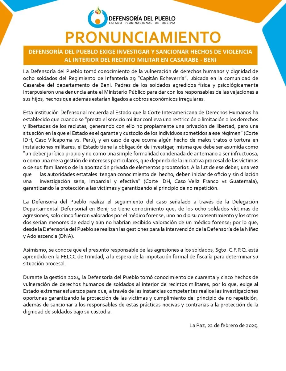 “La Defensoría del Pueblo realiza el seguimiento del caso señalado a través de la Delegación Departamental Defensorial en Beni. Se tiene conocimiento que, de los ocho soldados víctimas de agresiones, solo cinco fueron valorados por el médico forense, uno no dio su consentimiento y los otros dos serían menores de edad y aún no habrían recibido valoración; por lo que, desde la Defensoría del Pueblo se realizan las gestiones para la intervención de la Defensoría de la Niñez y Adolescencia”, señaló el ente defensorial por medio de un comunicado.