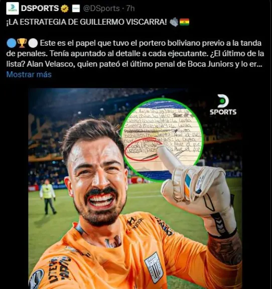 DIRECTV Sports hizo eco de la noticia y lo publicó en sus redes: “¡LA ESTRATEGIA DE GUILLERMO VISCARRA! Este es el papel que tuvo el portero boliviano previo a la tanda de penales. Tenía apuntado al detalle a cada ejecutante. ¿El último de la lista? Alan Velasco, quien pateó el último penal de Boca Juniors y lo erró por el análisis perfecto del golero de Alianza Lima. EL VERDADERO HÉROE DE LA NOCHE”.