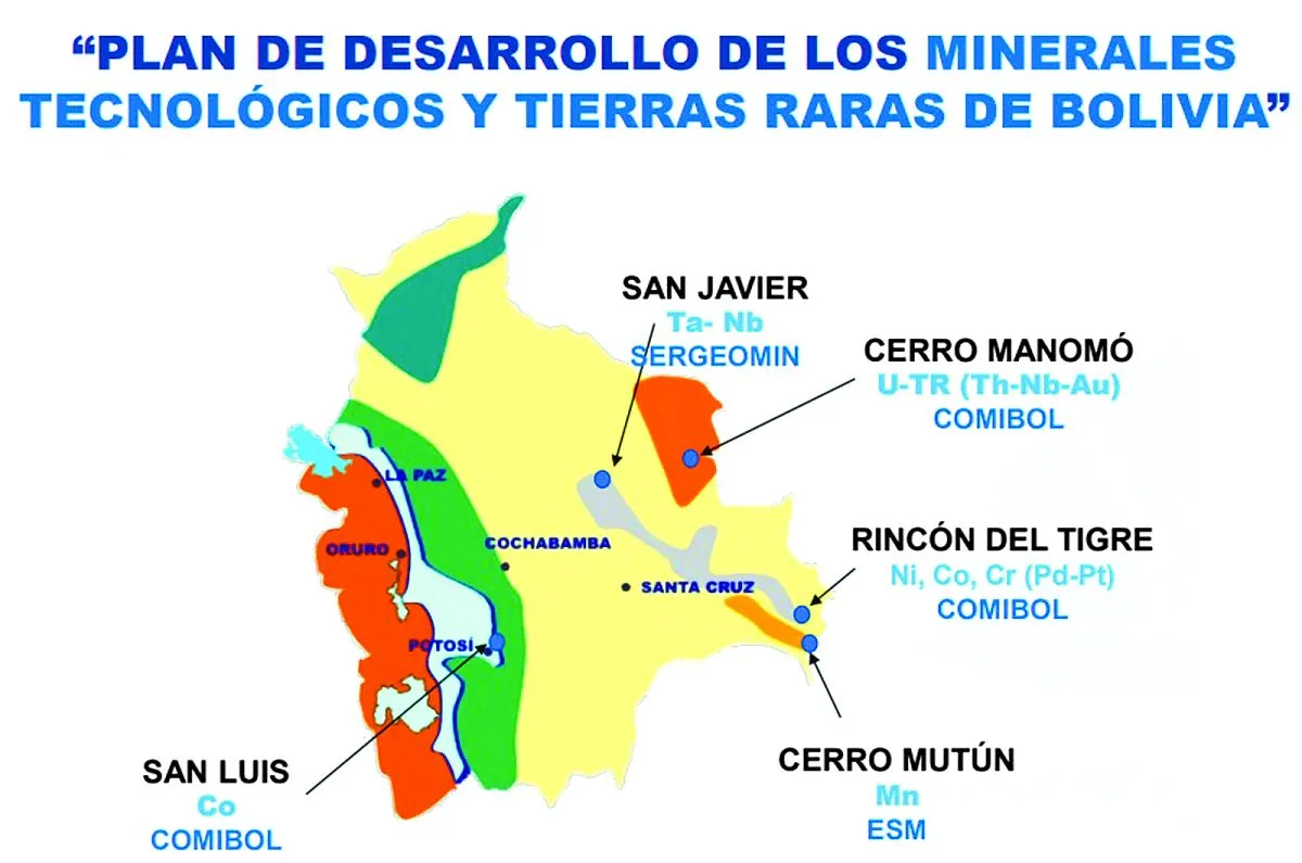 Bolivia cuenta con un mapa de zonas con altos potenciales de estos recursos, por lo que se creó en 2024 la Gerencia de Minerales Tecnológicos y Tierras Raras, dependiente de la Comibol, instancia que ayuda a la transición en la prospección, exploración y explotación de minerales tradicionales por los tecnológicos.