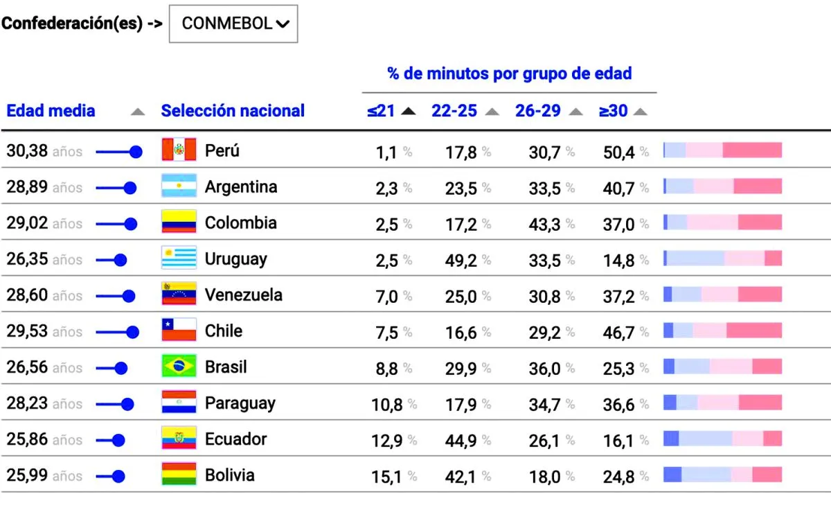 La más veterana es Perú cuyas convocatorias tienen un promedio de 30,38 años. Después están Chile (29,5), Colombia (29), Argentina (28,8), Venezuela (28,6) y Paraguay (28,2).