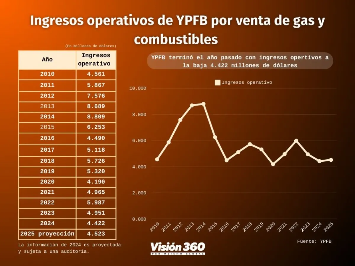 Los 4.422 millones de dólares obtenidos el año pasado representan aproximadamente la mitad de los 8.689 millones que YPFB logró en 2013 o el récord de 8.809 millones de dólares obtenidos en 2014 durante el boom de precios de los hidrocarburos.