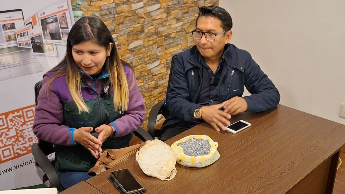 Loysi Marcos de la Asociación Warmis Recicbol y Marcelo Nina de la Asamblea de DDHH, con el producto procesado a partir del reciclaje de bolsas. Foto: Visión 360