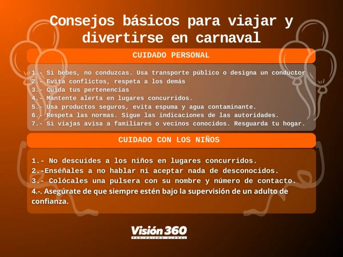 Es importante que las personas se diviertan pero con responsabilidad durante los festejos de carnaval, que se no se abuse con la ingesta de bebidas, cuidar a los niños y proteger los bienes propios, en caso de viaje.
