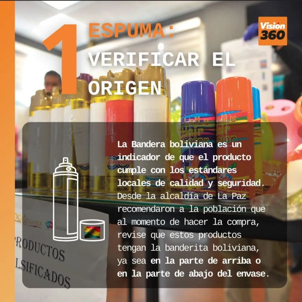 En el caso de adquirir espumas, una de las principales recomendaciones es la de verificar  si el envase cuenta con la imagen de la “bandera boliviana”, un símbolo que indica que el producto cumple con los estándares locales de calidad y seguridad.
