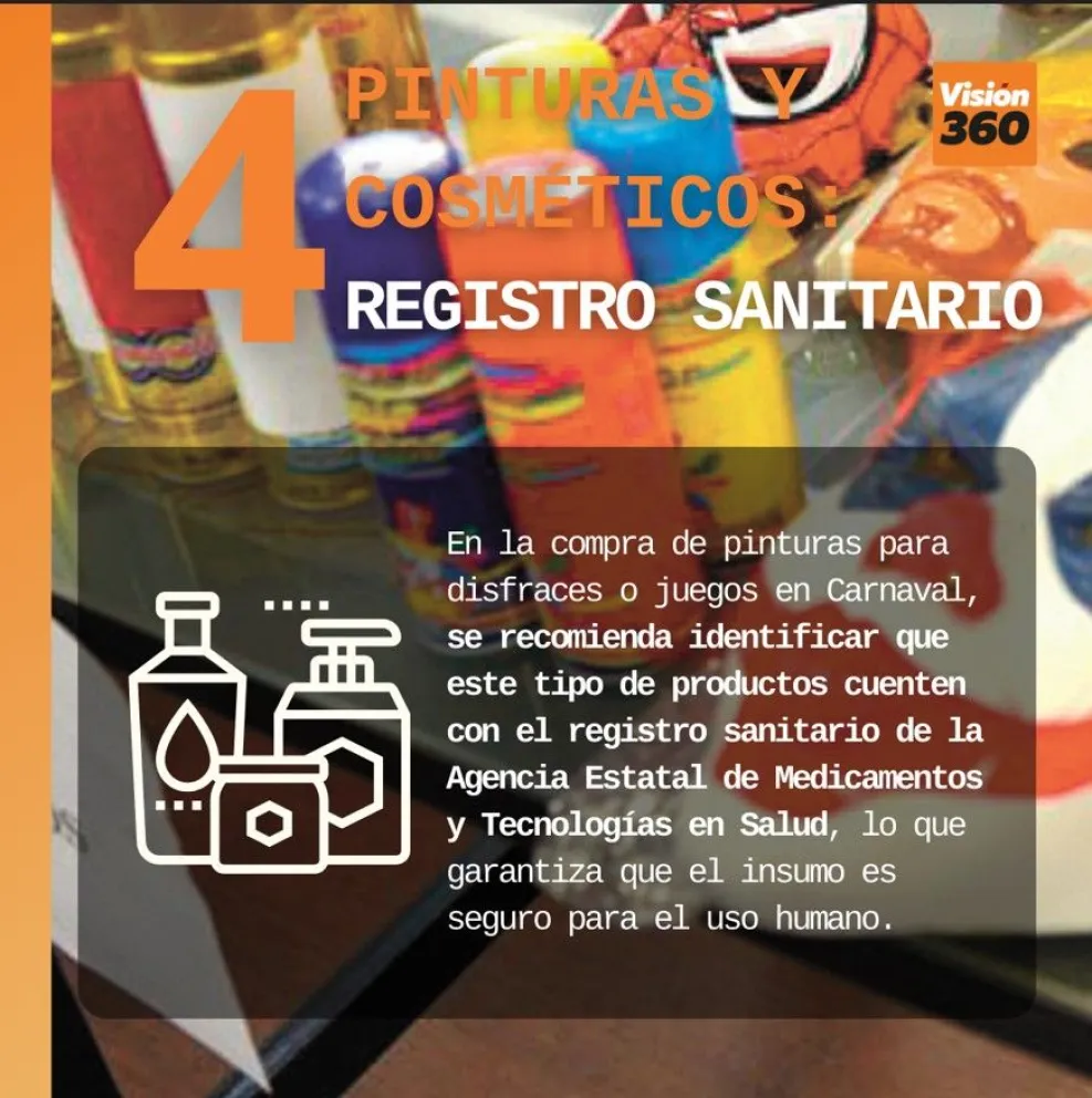 4. En la compra de pinturas para disfraces o juegos en Carnaval, se recomienda identificar que este tipo de productos cuenten con el registro sanitario de la Agencia Estatal de Medicamentos y Tecnologías en Salud, lo que garantiza que el insumo es seguro para el uso humano.