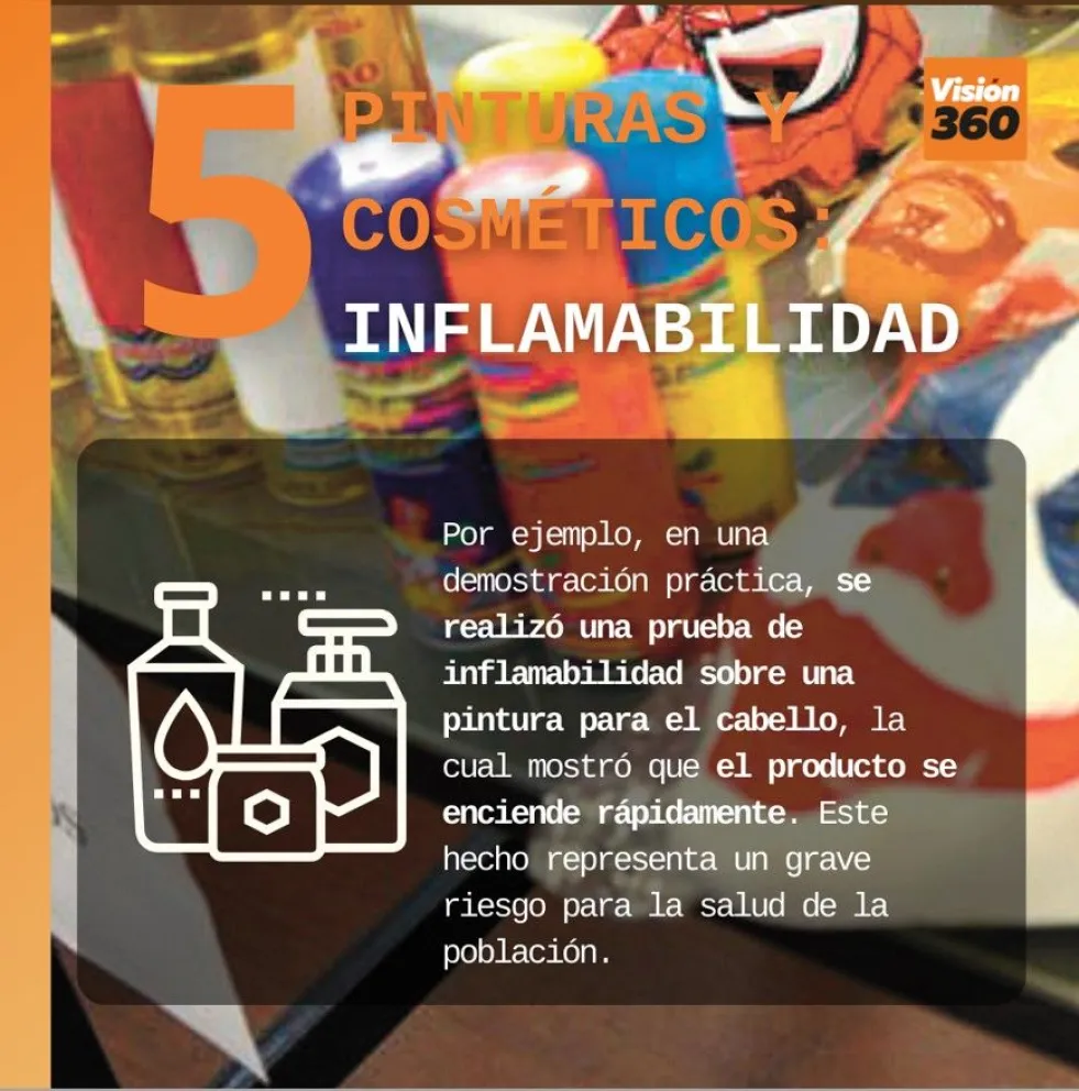 5. Por ejemplo, en una demostración práctica, Quispe realizó una prueba de inflamabilidad sobre una pintura para el cabello, la cual mostró que el producto se enciende rápidamente. Este hecho representa un grave riesgo para la salud de la población.