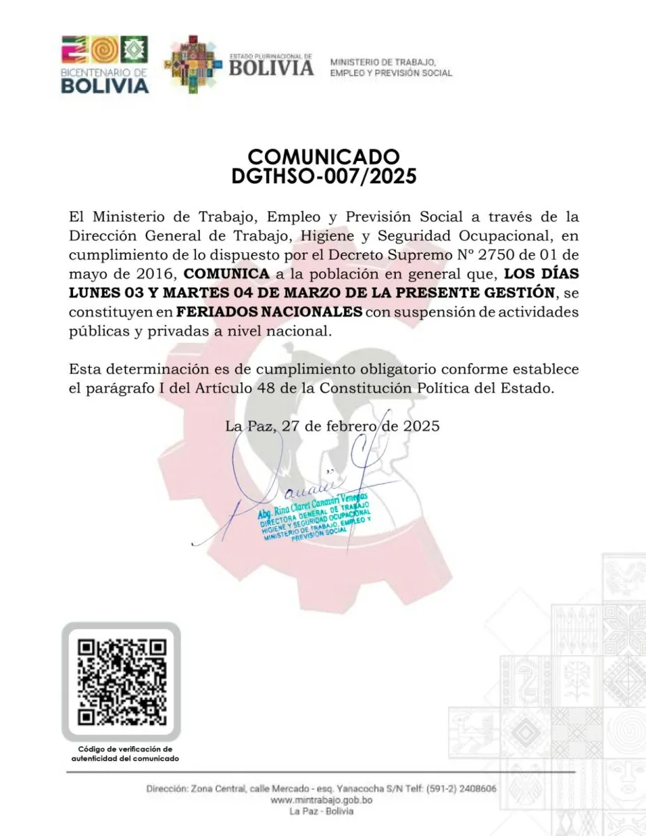 “Los días lunes 03 y martes 04 de marzo de la presente gestión se constituyen en feriados a nivel nacional, con suspensión de actividades públicas y privadas”, señala el comunicado DGTSHO - 007 / 2025.