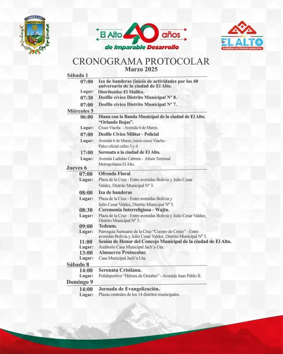 “40 años de la ciudad más joven de Bolivia, una ciudad pujante, trabajadora, orgullosos de ser alteños y que viva la ciudad de El Alto”, declaró de forma breve la alcaldesa, en entrevista con Red Uno.