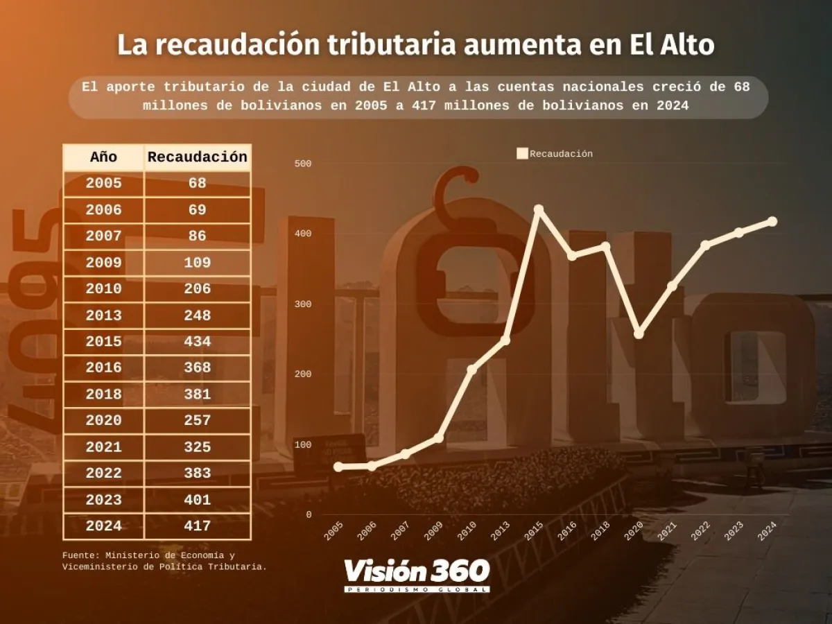 El Alto también contribuye a las cuentas nacionales. Las empresas y diferentes unidades económicas de la urbe en 2005 aportaban en impuestos 68 millones de bolivianos, pero en 2024, este valor aumentó a 417 millones de dólares, revelan los datos del Ministerio de Economía.