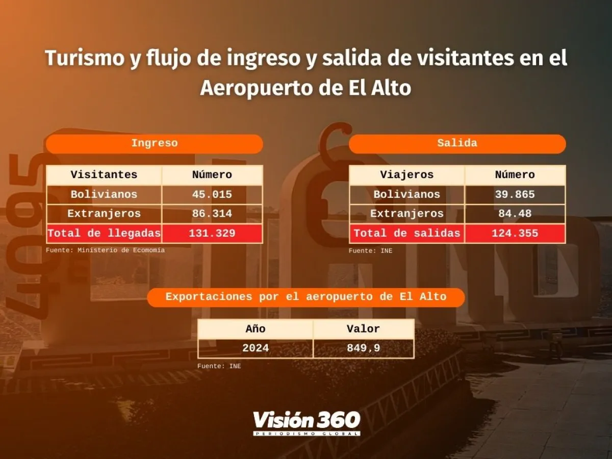 De acuerdo con el Ine, el año pasado se registró la llegada a La Paz, por el aeropuerto internacional de El Alto, de 86.314 visitantes extranjeros y de 45.015 bolivianos, que hacen un total de 131.329 viajeros.